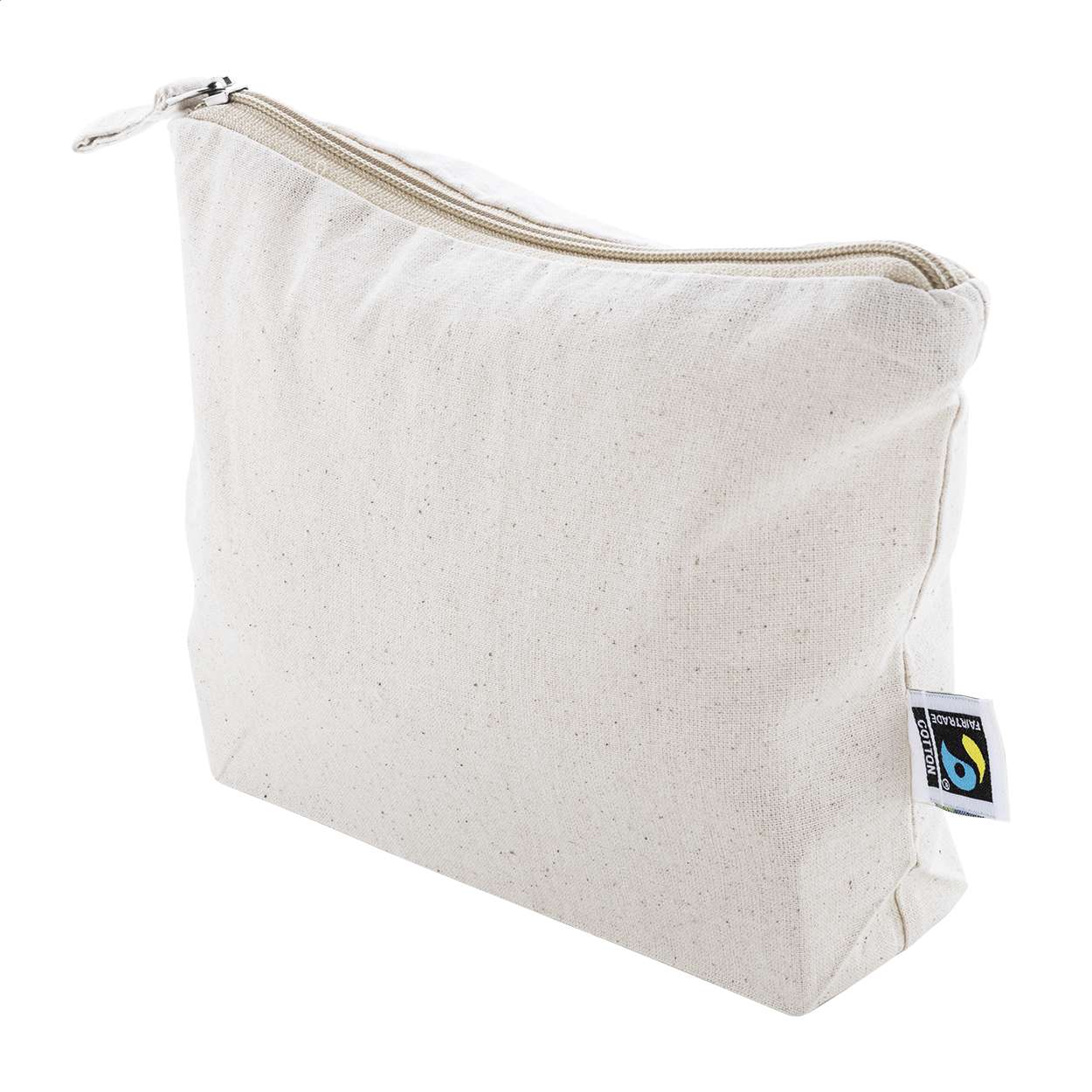 Trousse per cosmetici in 100% cotone equosolidale da 180 g/m² con cerniera ed etichetta Fairtrade.