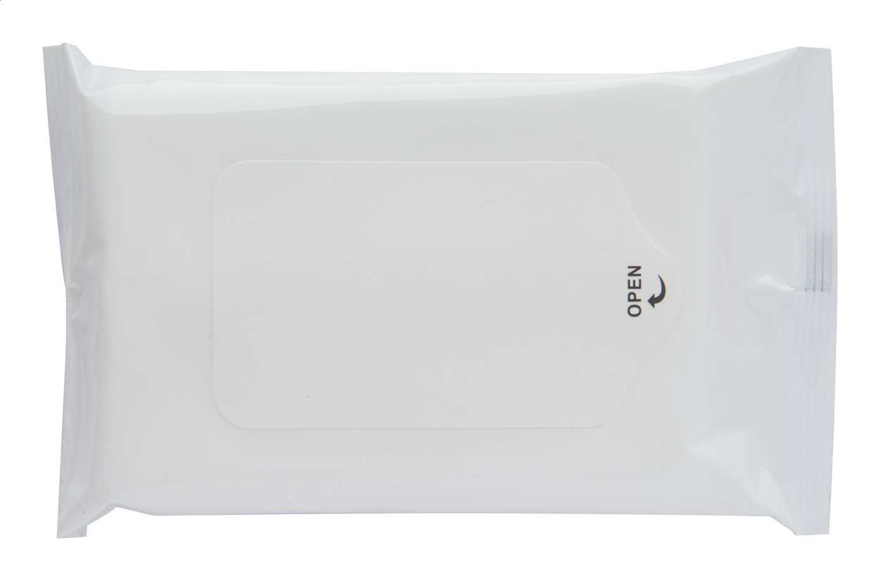 10 salviette umidificate in sacchetto risigillabile. Dimensioni delle salviette non piegate: 19×16 cm. Ideale per personalizzazione tampografica o con adesivo vinilico a colori.