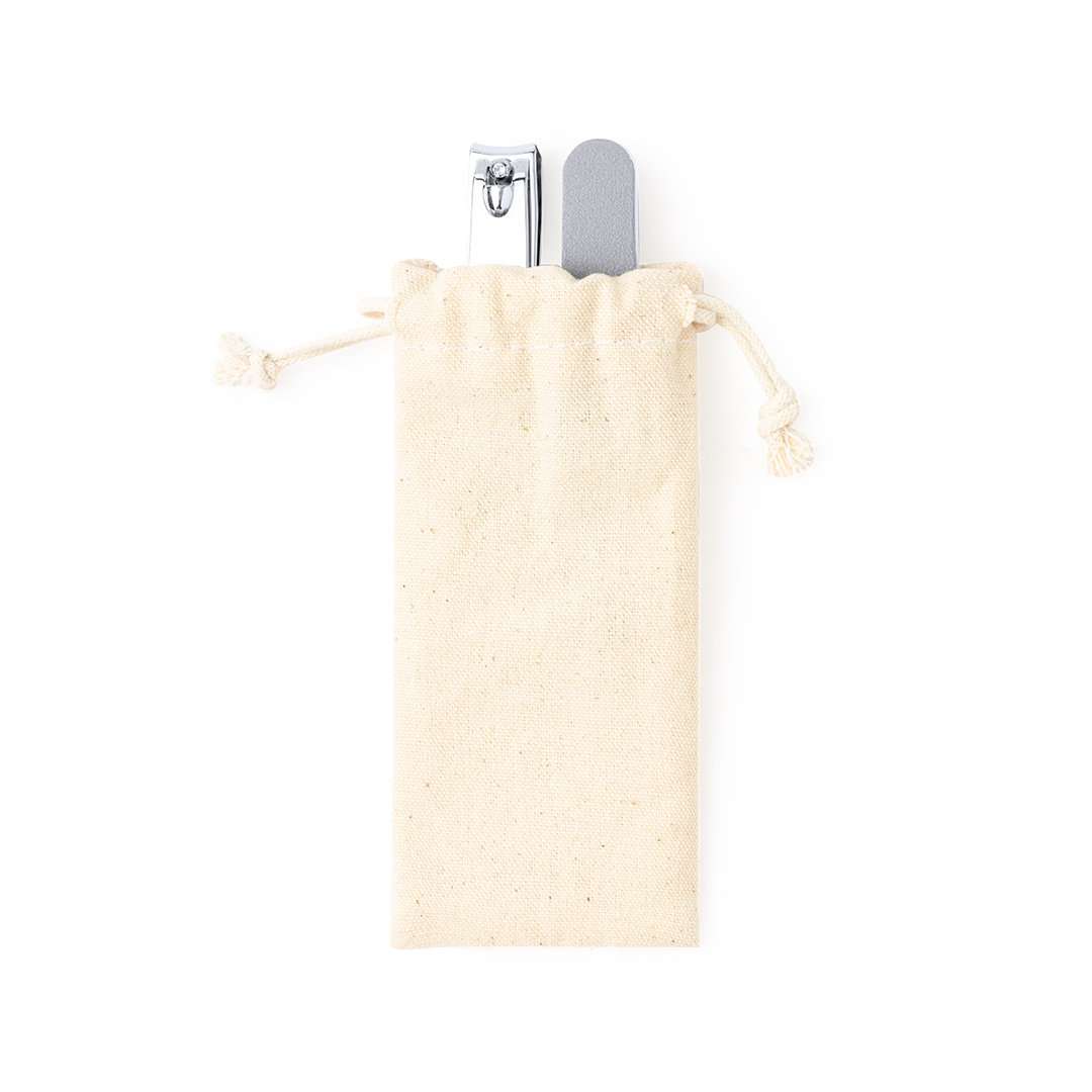 Set per manicure con fresa e lima per unghie. Presentato in un astuccio individuale in cotone naturale con chiusura a cordoncino.