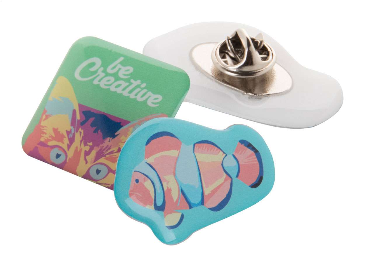 Spilla con personalizzazione in resina epossidica e pin in metallo. Personalizzabile sia nella forma che nel design. Dimensione massima: 9 cm². Quantità minima: 100 pezzi.