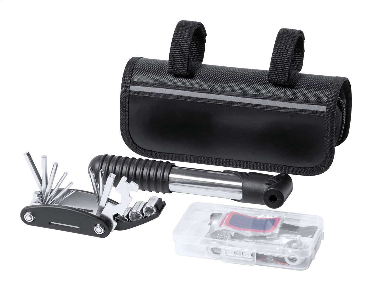 Kit di riparazione bici in pratica borsa porta attrezzi con sistema di fissaggio al telaio della bici. Comprende: attrezzo multiuso con 15 funzioni, chiave esagonale, mini pompa e kit di riparazione delle forature (2 leve per pneumatici, piastra per grattare e 6 toppe). poliestere 600D.