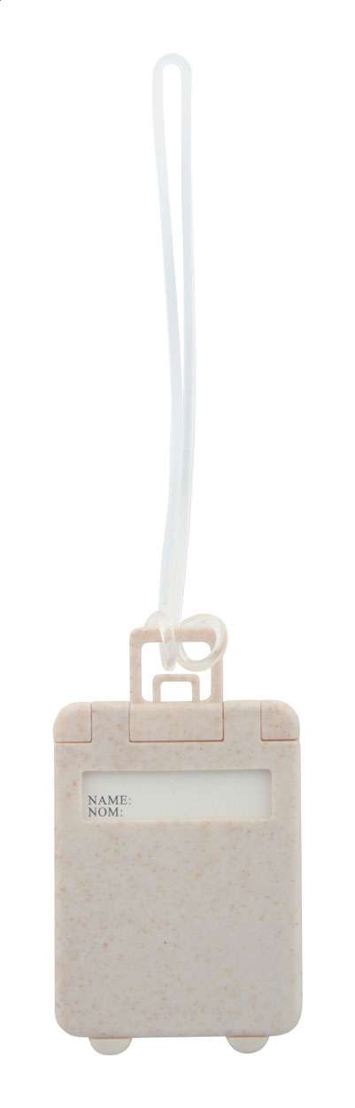 Etichetta per bagagli in plastica ecologica di paglia di grano a forma di trolley con cinghia elastica.