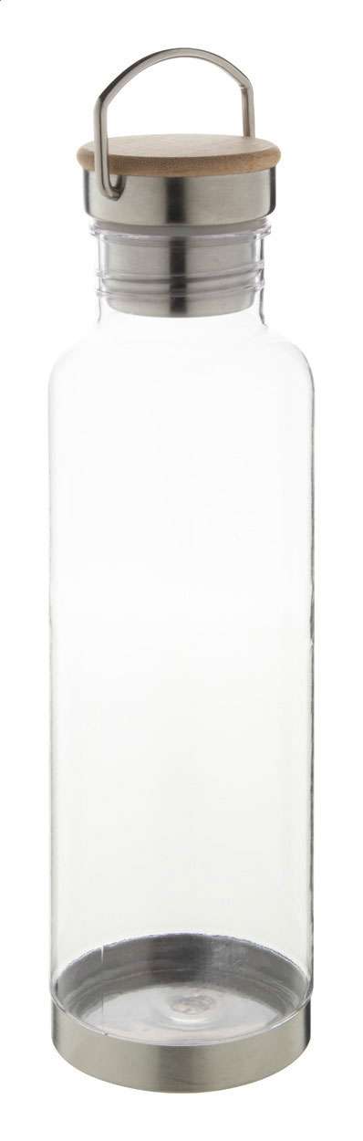 Borraccia da 800ml. in Tritan senza BPA con fondo in acciaio inossidabile e tappo con inserto in bambù. Non adatta per l'utilizzo con bevande gassate.