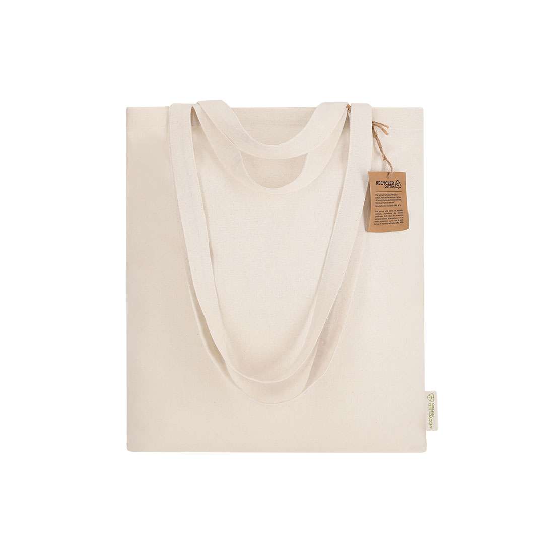Borsa con fondo realizzata principalmente in cotone riciclato di 140g/m2. Dotata di doppio manico: manici lunghi di 70 x 2,5 cm e manici corti di 30 x 2,5 cm. Include il distintivo di Cotone Riciclato. Resistenza fino a 6 kg di peso.