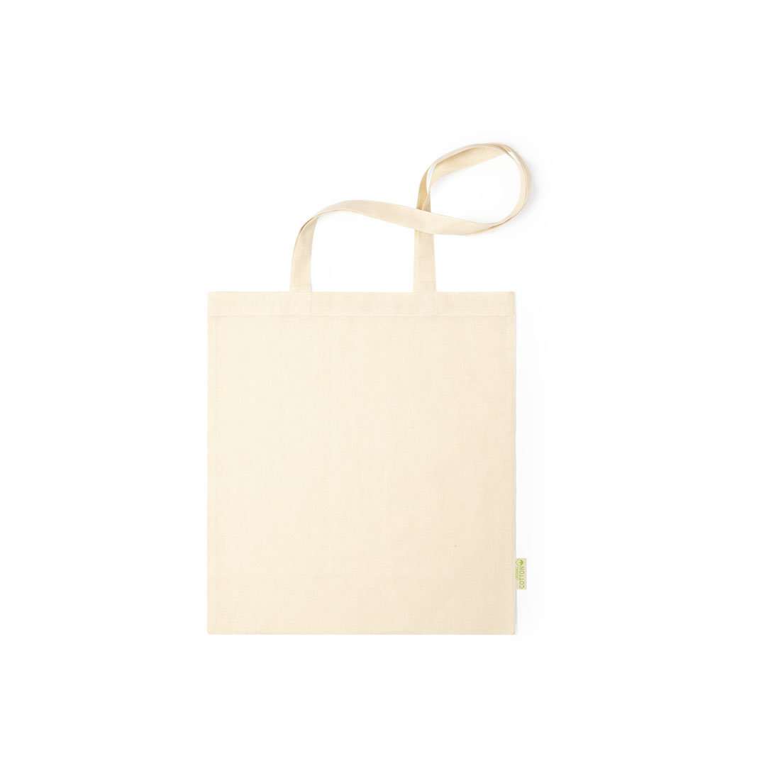 Borsa linea Nature in materiale di cotone organico naturale al da 120 g / m2. Manici lunghi 70 cm con rinforzo e finitura cucita. Etichetta organica sull'etichetta laterale e resistenza fino a 8 kg di peso.