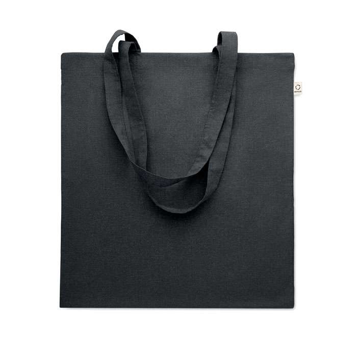 Shopper in cotone riciclato post-consumo (70% cotone riciclato e 30% RPET) con manici lunghi. 140 gr/m². Questo articolo può restringersi dopo la stampa.