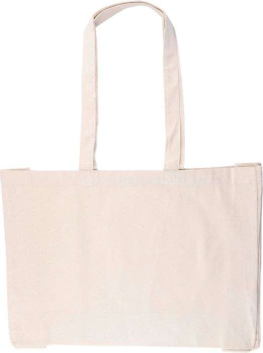Shopping bag in cotone Oeko-Tex 220g/m2, cotone naturale, soffietto da 10 cm, manici lunghi, peso massimo trasportabile circa 8 kg, include etichetta Oeko-Tex®