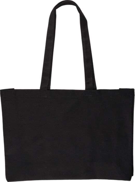 Shopping bag in cotone Oeko-Tex 280g/m2, cotone colorato nero, soffietto da 10 cm, manici lunghi, peso massimo trasportabile circa 8 kg, include etichetta Oeko-Tex®