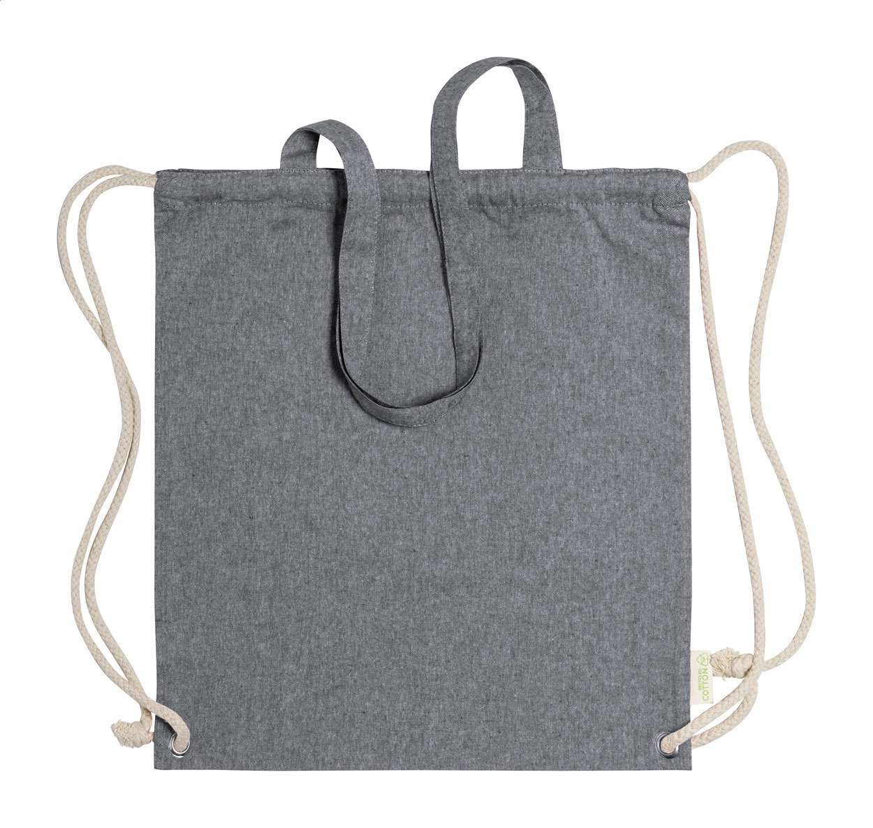 Borsa con chiusura a coulisse in cotone riciclato e lunghi cordoncini intrecciati e spessi. Può essere utilizzata anche come borsa per la spesa. 100% cotone riciclato, 140 g/m².