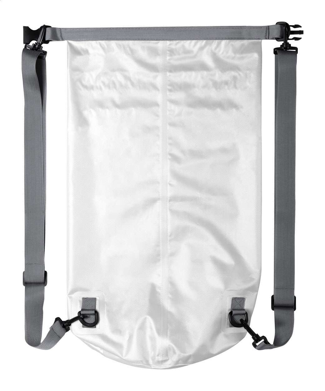 Sacca zaino impermeabile, in tessuto ripstop, spallacci regolabili e fibbia in plastica.