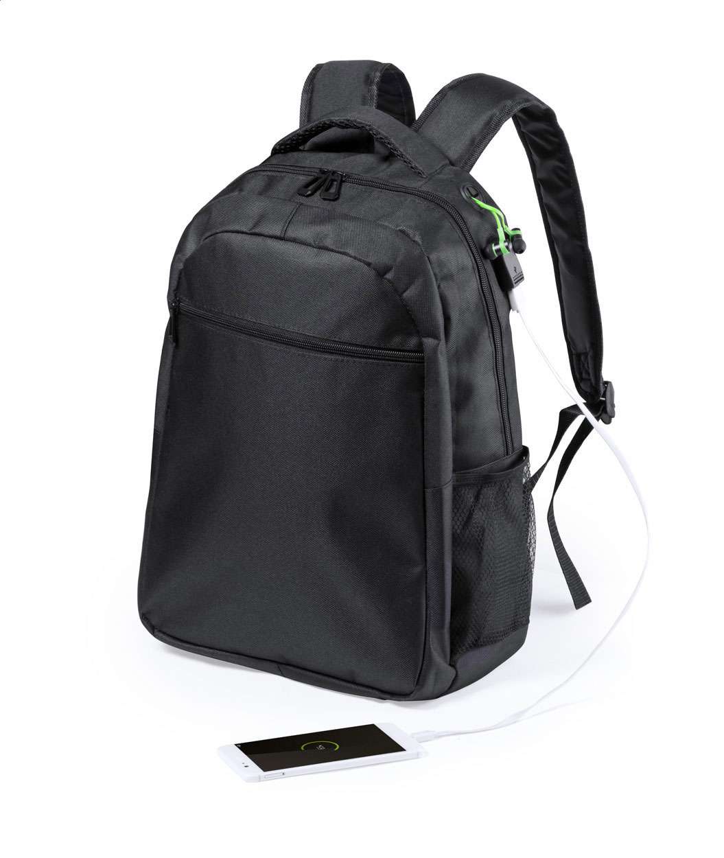 Zaino impermeabile con scomparti e cerniera, scomparto imbottito per computer portatile (15") e tablet (10"), schienale e tracolla imbottiti. Con presa per auricolari e connettore USB integrato per power bank. Poliestere 600D.