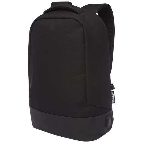 Zaino in RPET certificato GRS che dispone di scomparto principale aperto con pannello divisorio, custodia per portatile da 15" imbottita e 2 tasche con protezione RFID. Porta USB sul lato destro per collegare e caricare facilmente i dispositivi dall'interno. Dispone di spallacci imbottiti, tracolla per spalla destra, tasca nascosta con cerniera, maniglia e passante per trolley. Per realizzare questa borsa, sono state riciclate circa 15 bottiglie di plastica.