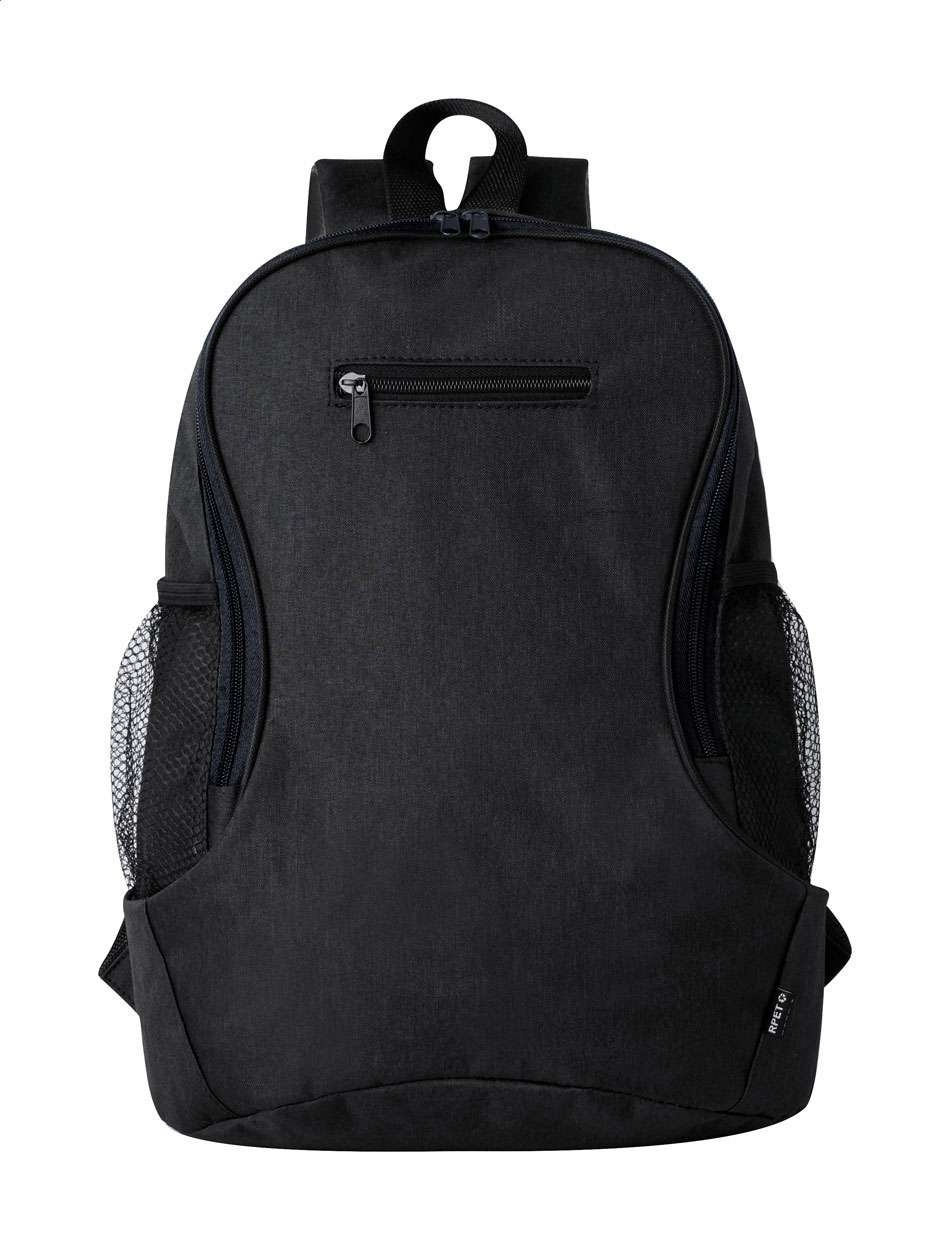Zaino in poliestere 300D RPET con scomparto chiuso da cerniera, tasca frontale, tasche laterali in rete, schienale e spallacci imbottiti ed etichetta RPET.
