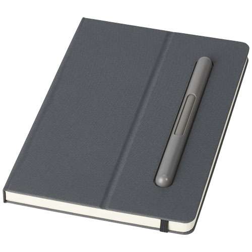 Il set con penna a sfera e blocco note Skribo è realizzato in parte con poliestere riciclato post-consumo certificato RCS, che lo rende una scelta più sostenibile in quanto contribuisce a ridurre l'uso di materie prime vergini. Con una penna a sfera con inchiostro blu e 80 fogli color crema a righe in carta riciclata da 80 g/m² proveniente da fonti sostenibili. La capacità di scrittura della penna è di 1000 metri.
