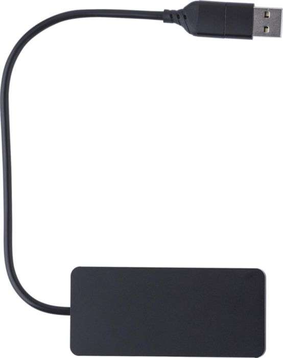 Stazione Hub USB in alluminio riciclato, include due porte USB A, una porta USB C, logo 'materiale riciclato' inciso sul davanti