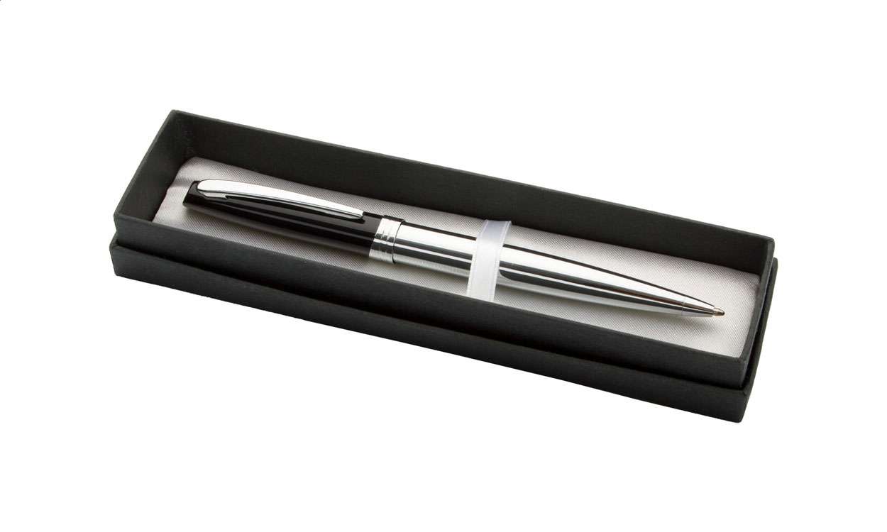 Penna a sfera in metallo con cappuccio nero laccato, corpo cromato lucido e clip. In confezione regalo e refill blu.