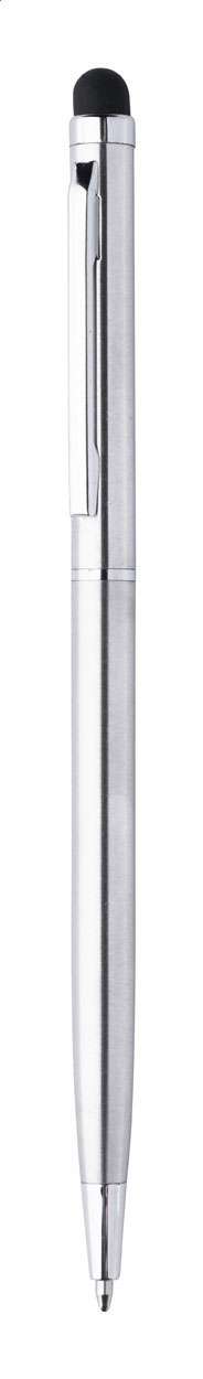 Penna a sfera capacitiva in acciaio riciclato con refill blu, meccanismo di apertura a rotazione e parti cromate.