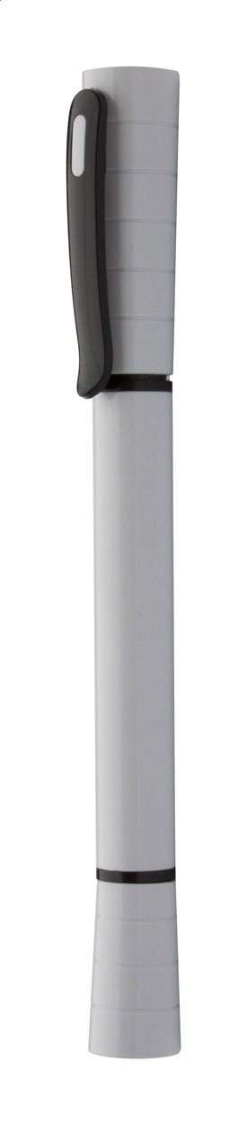 Penna a sfera in plastica con torcia ad 1 luce LED. Fornita con batteria a bottone e refill blu.