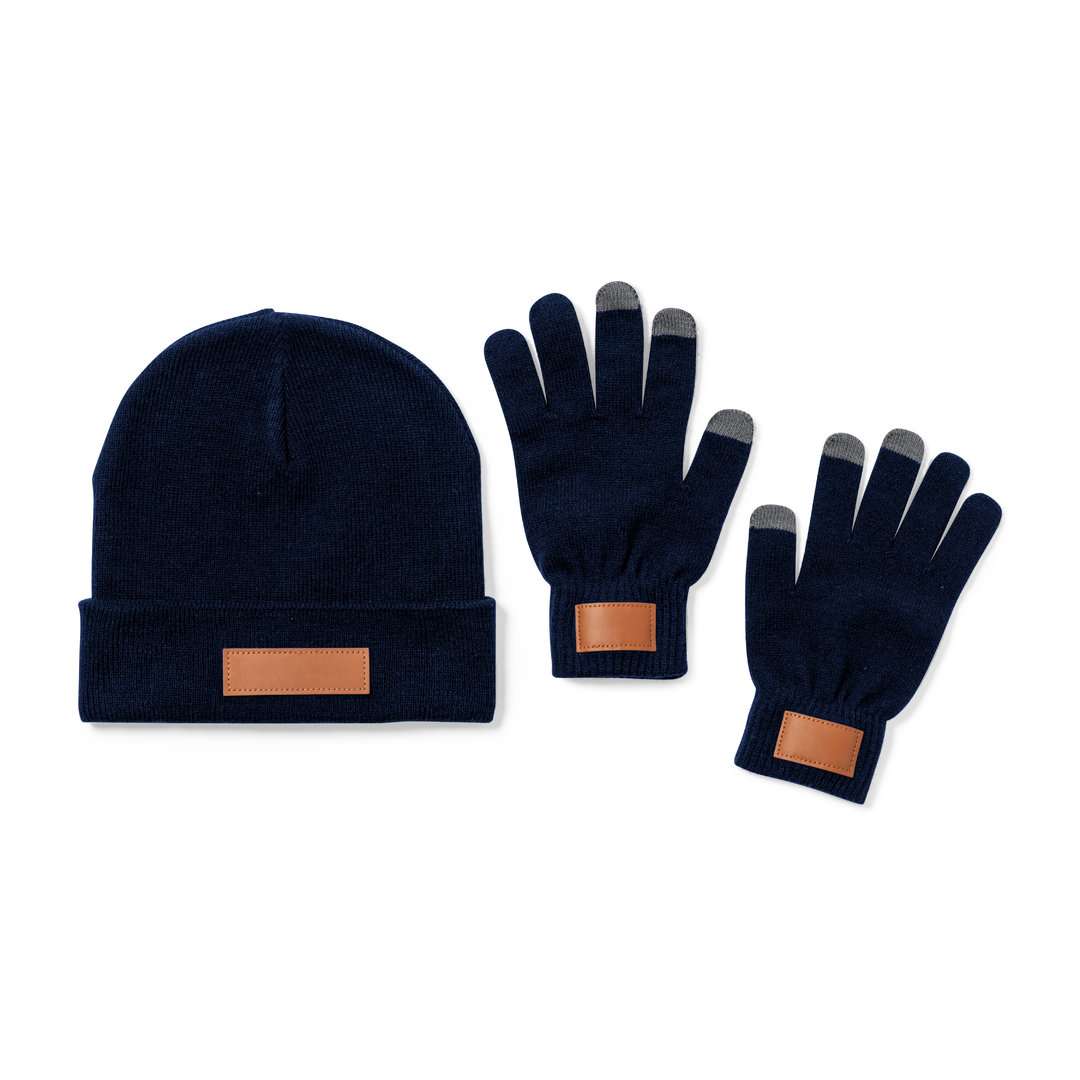 Set di cappello e guanti in taglia adulto, realizzati in materiale acrilico elastico e con patch in similpelle cucito per la stampa. Include: Paio di guanti con 3 dita tattili e regolazione elastica del polso. Cappello abbinato con bordo.
