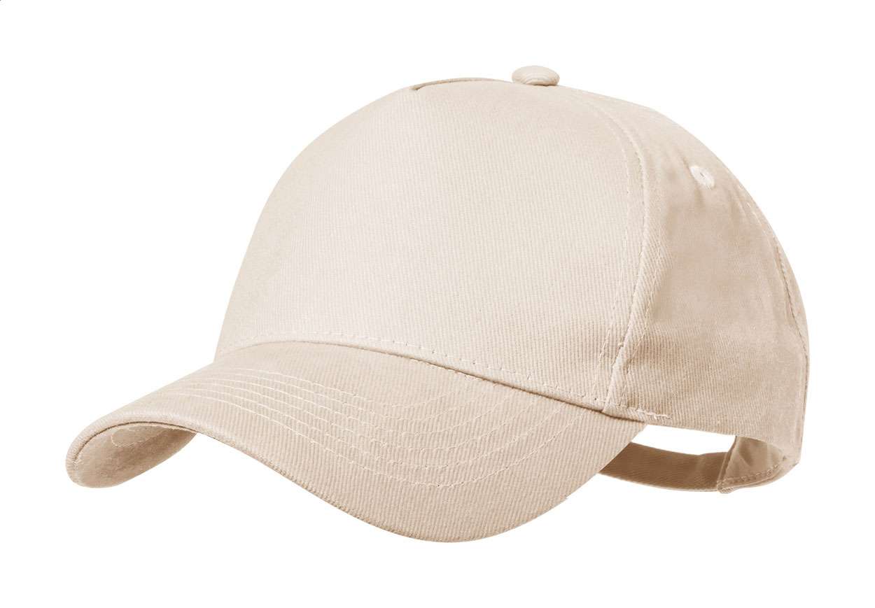 Cappellino da baseball in cotone biologico a 5 pannelli con chiusura a fibbia metallica.