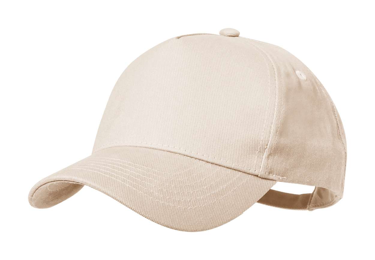 Cappellino da baseball in cotone biologico a 5 pannelli con chiusura a fibbia metallica.