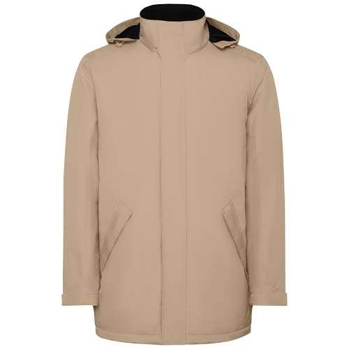 Giacca parka impermeabile imbottita da uomo. Collo alto con cappuccio ripiegabile e rimovibile con chiusura a strappo. Zip centrale abbinata con pattina. Tasche laterali con zip e pattina fissa. Tasca interna con chiusura a strappo. Polsini regolabili con passante a strappo. Accesso interno per rinforzi sul retro e sul petto a sinistra.