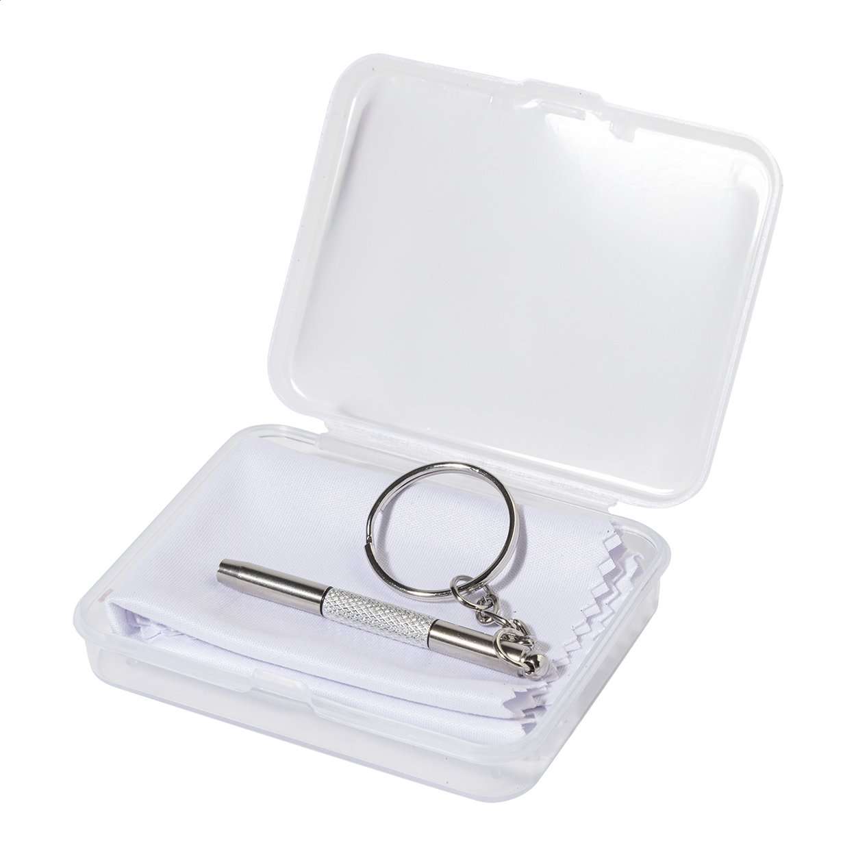 Kit compatto per la manutenzione degli occhiali contenuto in una scatola trasparente in PP. Il kit comprende un panno in microfibra 100% RPET (220 g/m²) e un mini cacciavite con portachiavi. Dimensioni del panno: 18×15 cm.