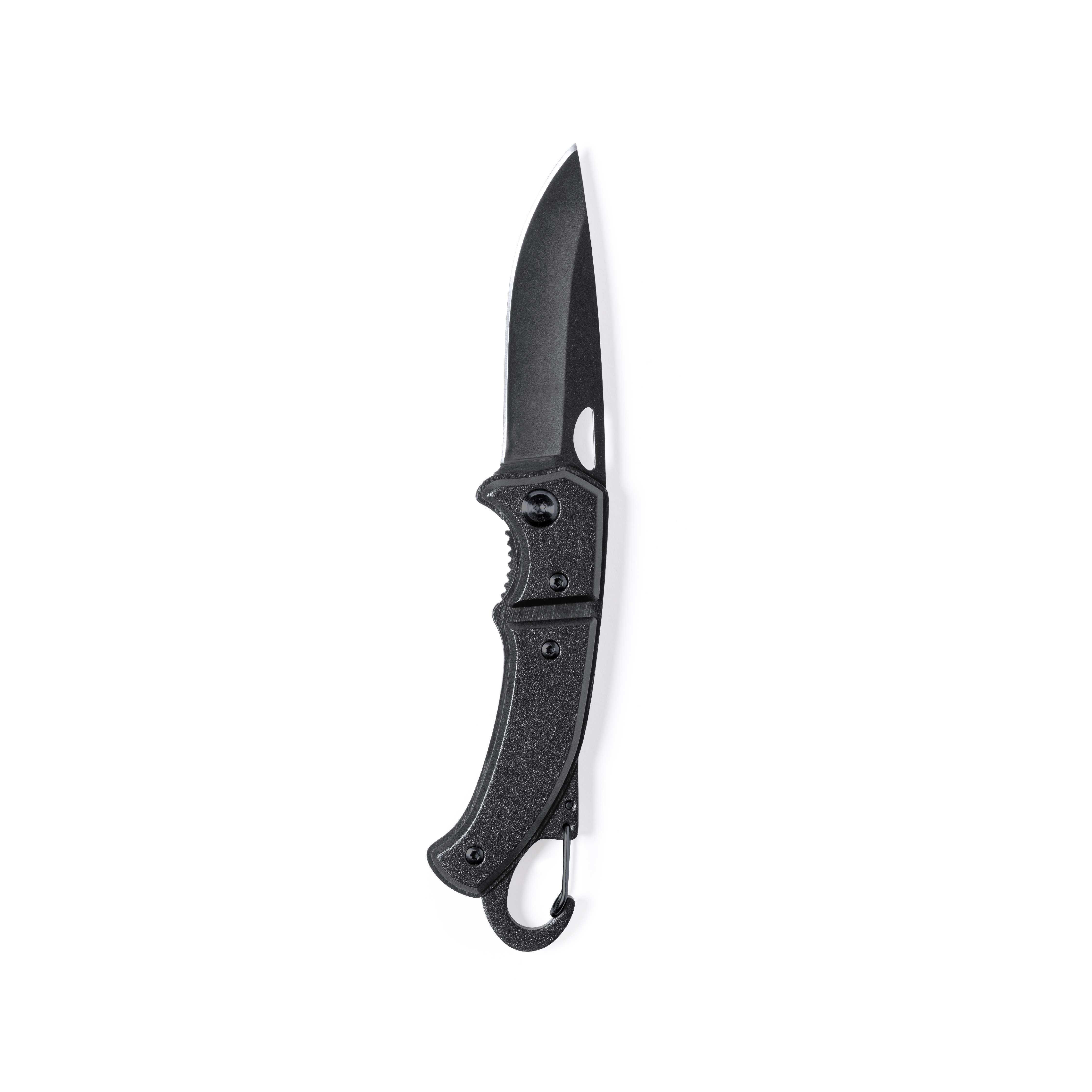 Coltello con lama in acciaio inox con finitura nera e manico in alluminio robusto abbinato. Con moschettone integrato nell'impugnatura e chiusura di sicurezza. Con lama fustellata per una facile apertura e confezionato in una scatola di design nera.
