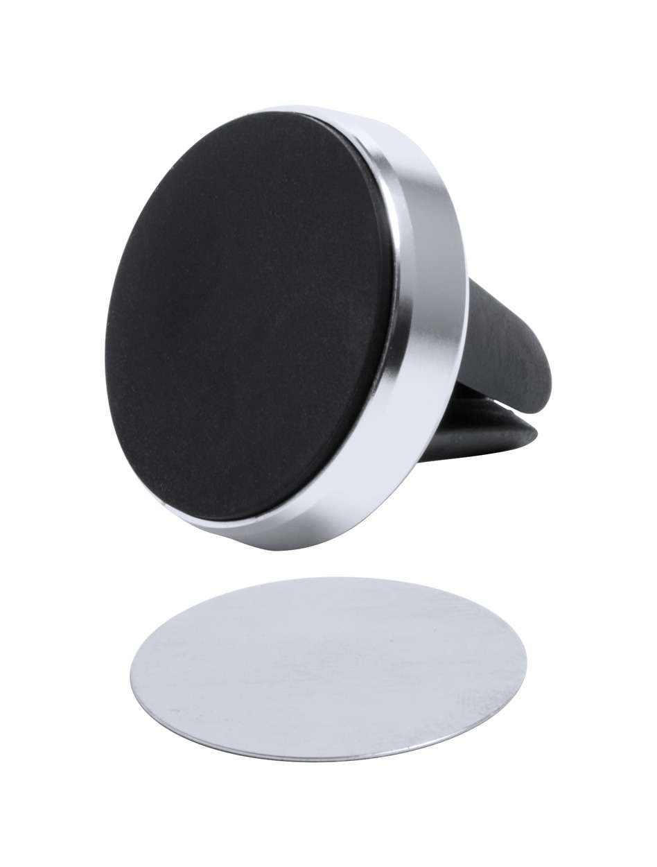 Supporto porta cellulare magnetico per auto in alluminio, con gancio di montaggio alle bocchette dell'aria. Piastra metallica autoadesiva compresa. In confezione regalo.
