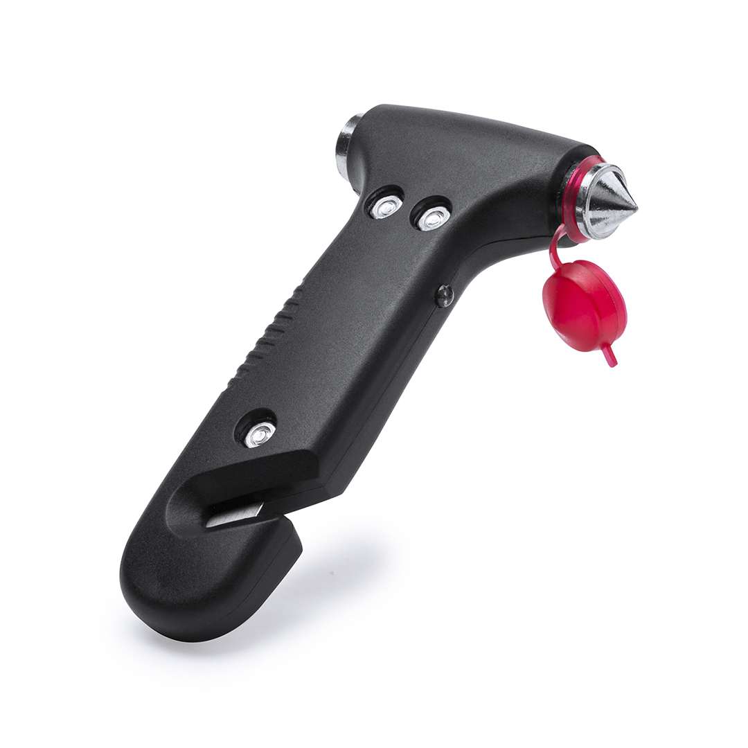 Martello di emergenza multifunzione a LED. Con torcia a led a luce bianca, martello frangivetro e lama tagliacinture. Presentato in un'attraente scatola di design.