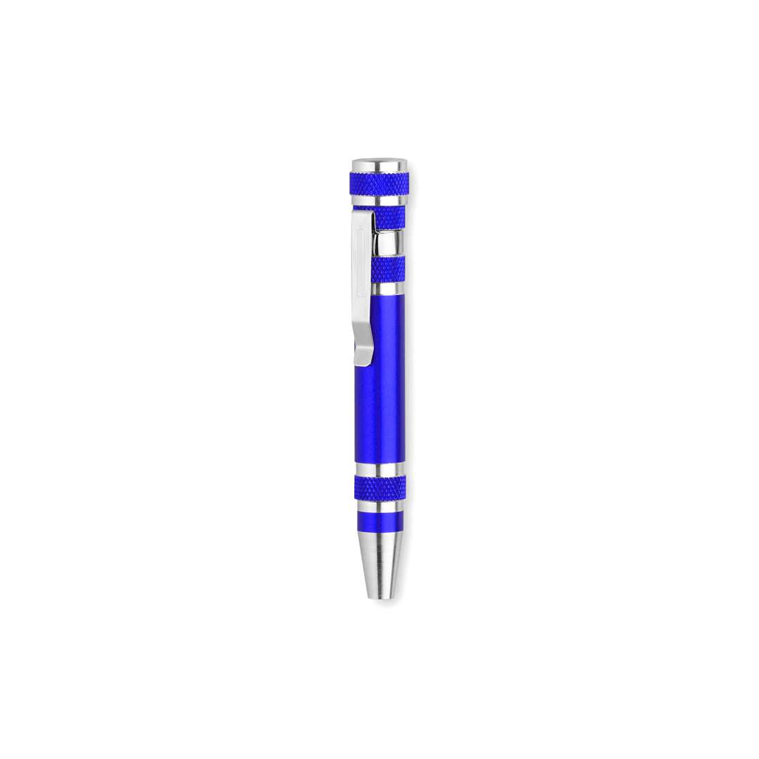 Multiutensile in alluminio con 6 accessori in una gamma di colori metallizzati brillanti. Con corpo antiscivolo e clip in metallo. Include 6 teste di cacciaviti piatti e a croce.