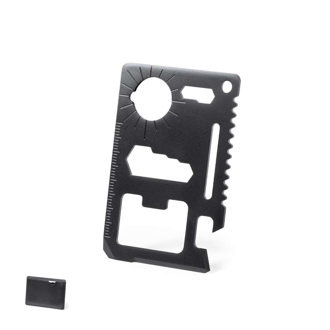 Multiutensile con corpo in robusto acciaio inossidabile con 11 strumenti. Con apriscatole, coltello, cacciavite, righello, apribottiglie, chiave inglese, chiave a farfalla, sega e indicatore di direzione. Presentato in una resistente custodia in similpelle.