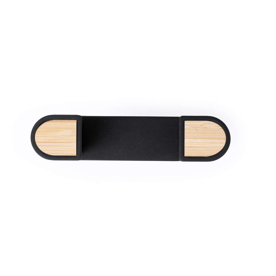 Porta smartphone regolabile dal design minimalista, con base rotante a 360° ed elegante finitura nera con dettagli in bambù. Con sistema di fissaggio alla griglia di ventilazione dell'auto e ampia superficie di stampa, appositamente progettata per la tampografia. Presentato in una scatola kraft di design. Materiali come il bambù favoriscono l'utilizzo di materie prime naturali, riducendo le emissioni inquinanti. Proviene da una pianta altamente resistente e versatile, con una rapida crescita e rigenerazione, rappresentando un'ottima alternativa all'uso del legno tradizionale.