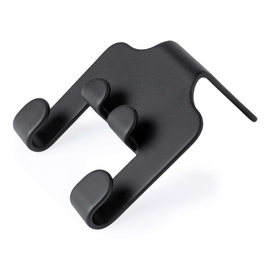 Robusta staffa in ABS. Facile installazione grazie al gancio aperto progettato per essere posizionato sul poggiatesta, con supporto per dispositivi mobili e due ganci aggiuntivi per le borse. Imbustato singolarmente.