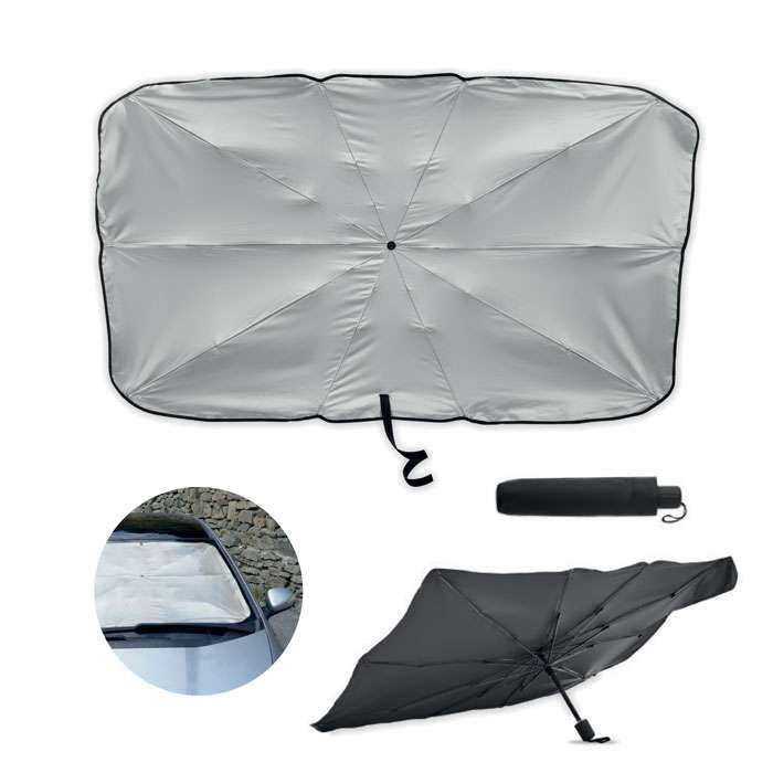 Ombrello parasole per auto in pongee 190T con 1 lato rivestito in argento. Apertura/chiusura manuale.