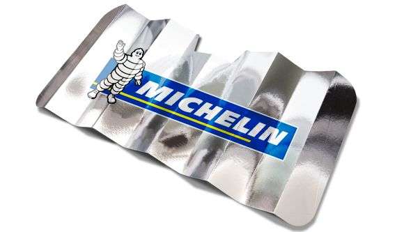 Parasole pieghevole per auto in cartone patinato lucido da gr 500 al mq con finitura metallizzata personalizzabile da uno a quattro colori. Questo parasole è realizzato in cartone ecologico rivestito, può essere piegato e chiuso per mezzo di una chiusura di plastica. Dimensione prodotto: 130x70 cm. Dimensione personalizzazione: 80x50 cm. Minimino ordinabile: 250 pezzi.