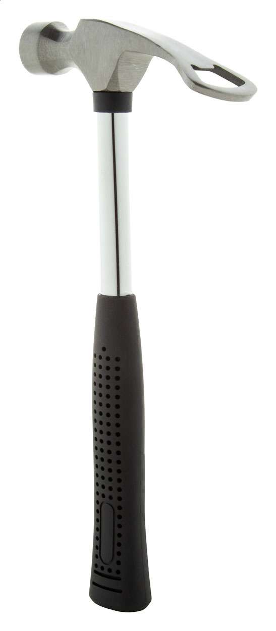 Martello in acciaio con apribottiglie e manico in gomma.