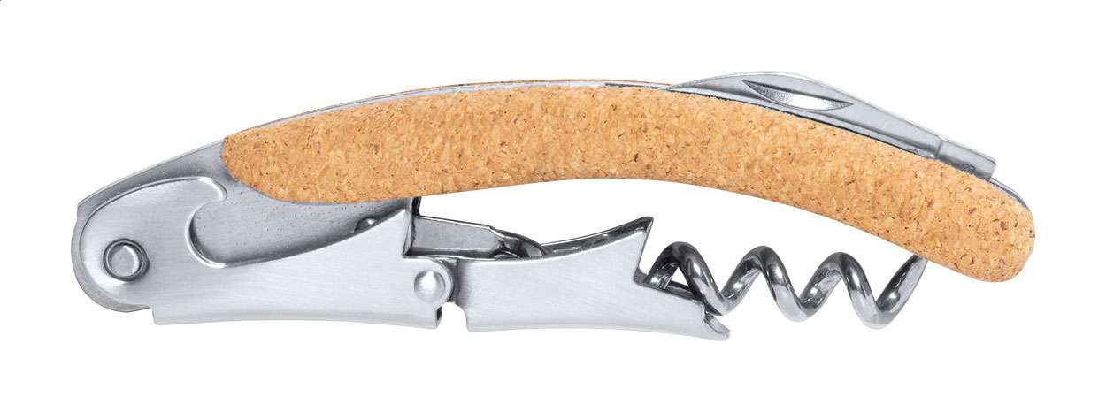 Apribottiglie e cavatappi in acciaio inossidabile con manico in sughero naturale.