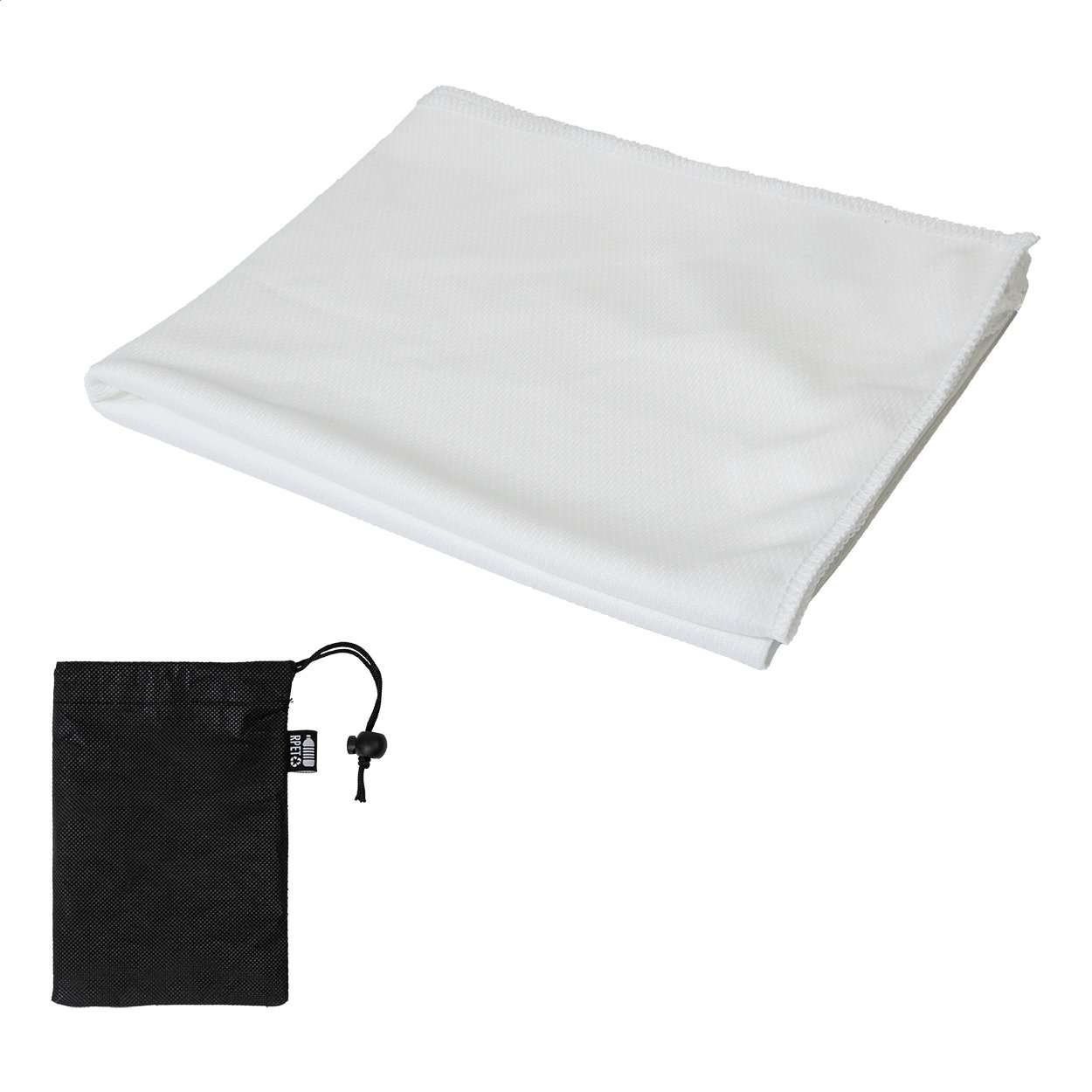 Asciugamano sportivo in microfibra RPET contenuto in un sacchetto di tessuto non tessuto RPET ed etichetta RPET. Poliestere RPET, 140 g/m².