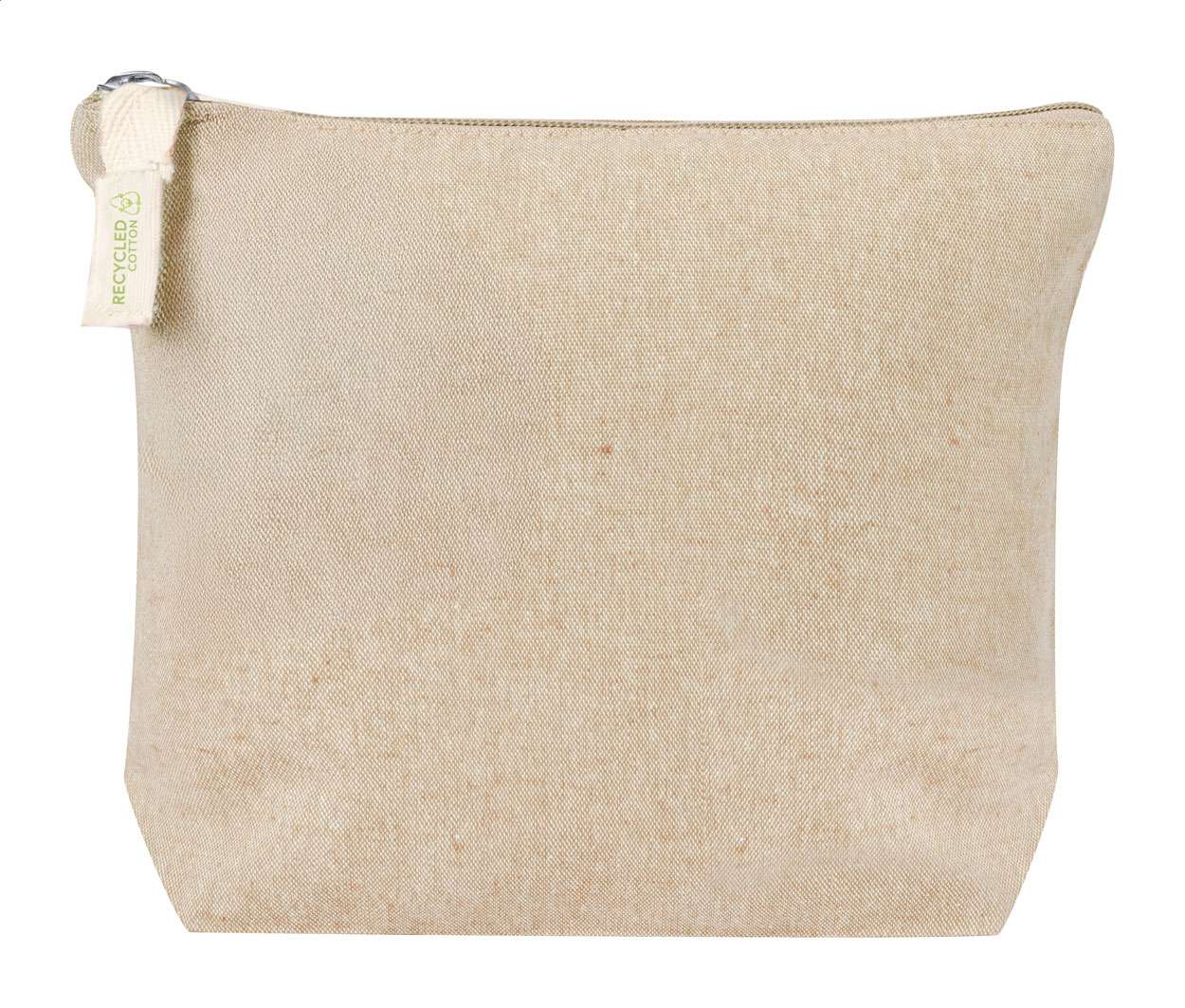 Pochette per cosmesi in cotone riciclato chiusa da una cerniera ed etichetta cotone riciclato.
