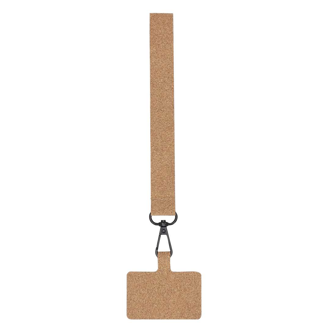 Supporto a braccialetto per smartphone in sughero. Con cinghia da trasporto coordinata e moschettone girevole in metallo nero.Realizzato con elementi a base vegetale per promuovere l'uso di materie prime naturali e ridurre le emissioni inquinanti.