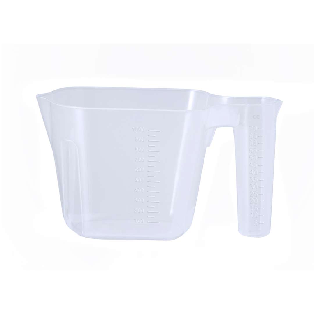 Caraffa graduata da 1 litro in resistente PP trasparente, con manico dosatore integrato. Scomparto principale con capacità di 1 litro, con misuratore laterale in sezioni da 50 ml. Impugnatura con gradazioni ancora più precise, con misuratore laterale e incrementi di 5 ml. Beccuccio per evitare fuoriuscite in entrambi i contenitori.