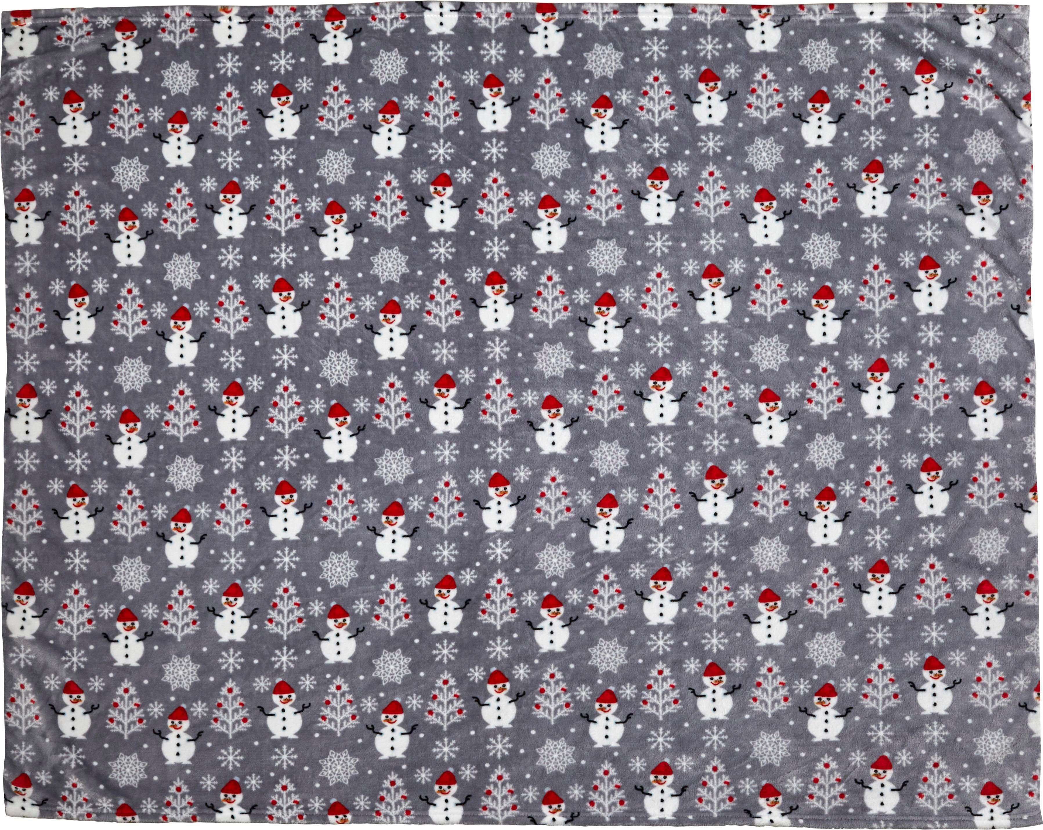 Coperta effetto flanella (260 g/m2), 100% poliestere, motivo a pupazzi di neve, la coperta è avvolta e chiusa da un nastro, dimensione: aperta +/- 120 x 150 cm