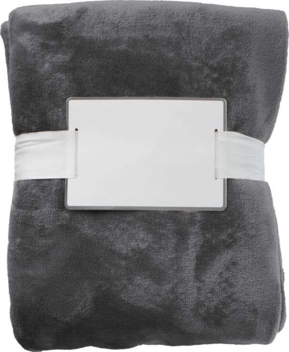 Coperta in pile 280 gr/m², si presenta confezionata con nastro e cartoncino stampabile, dimensioni coperta aperta 120 x 150 cm