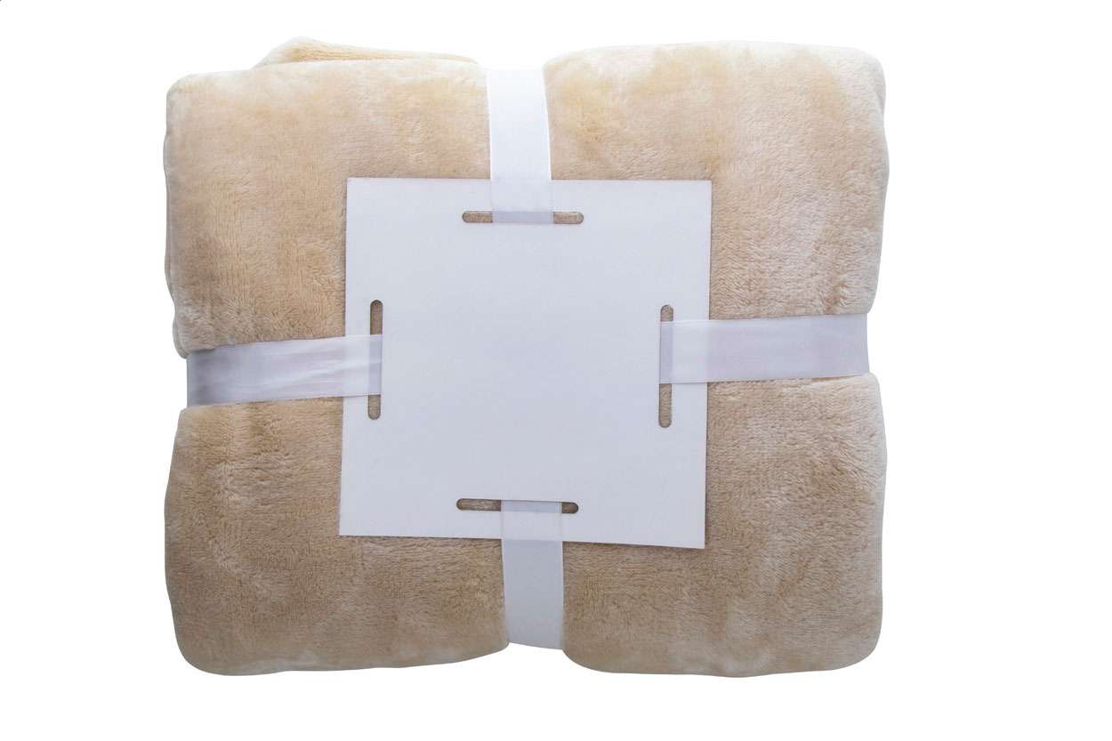 Coperta in pile di flanella, 280 gr/m². Confezionata con nastro bianco e cartoncino stampabile.