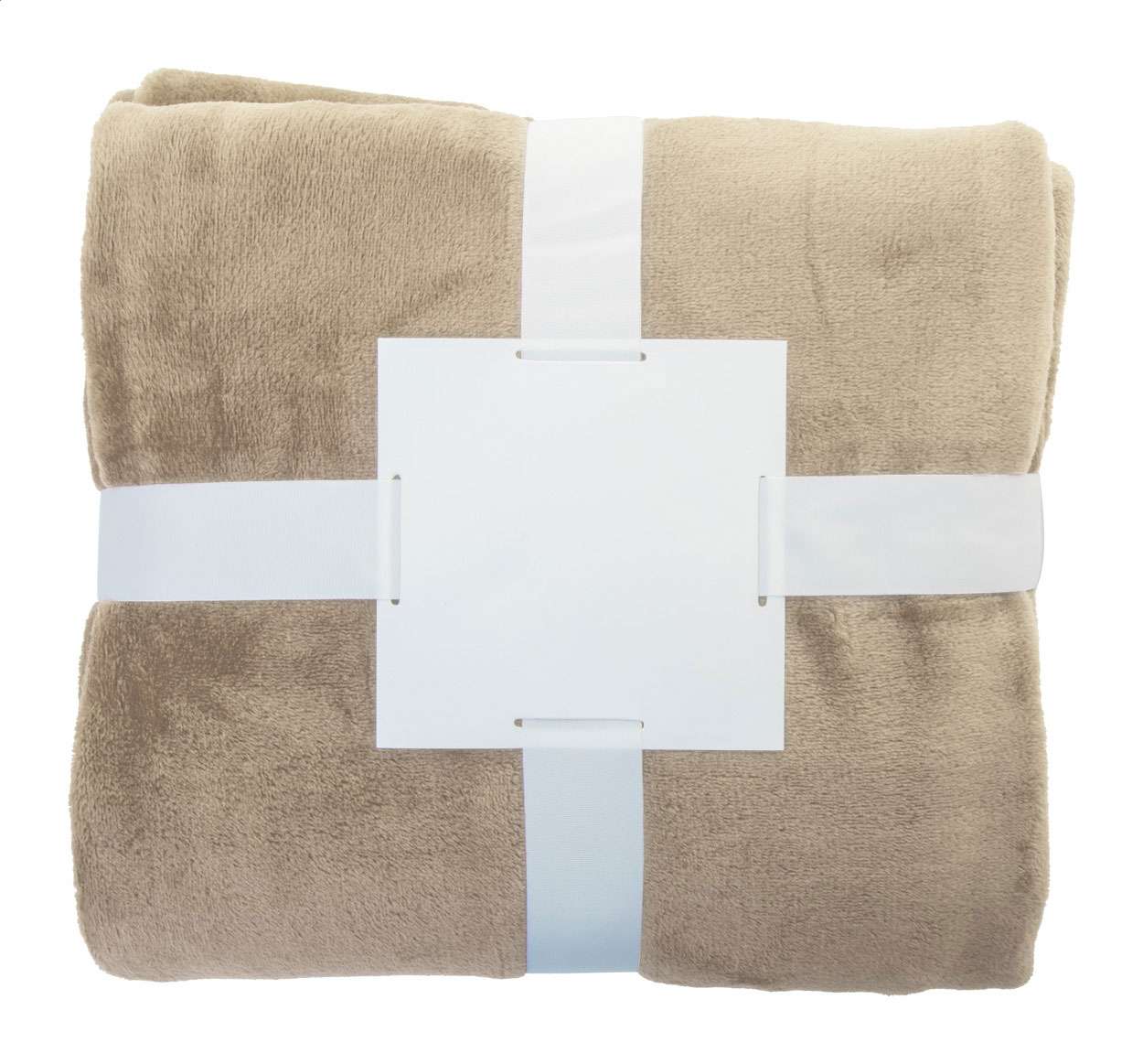 Coperta in pile di flanella RPET, 260 gr/m². Confezionata con nastro e cartoncino stampabile.