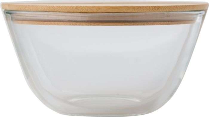 Insalatiera in vetro, coperchio in bambù, fascia removibile elastica in silicone, vetro speciale rinforzato (borosilicato), sottile ma resistente, capacità 1.200 ml, confezionato singolarmente in una scatola in cartone avana
