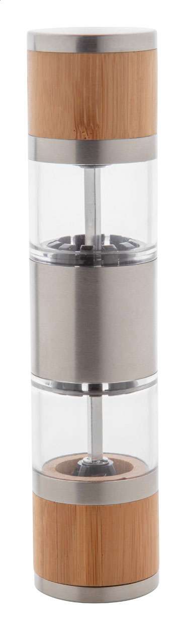 Doppia macina manuale per sale e pepe; macine in ceramica, corpo in acciaio inox e bambù.
