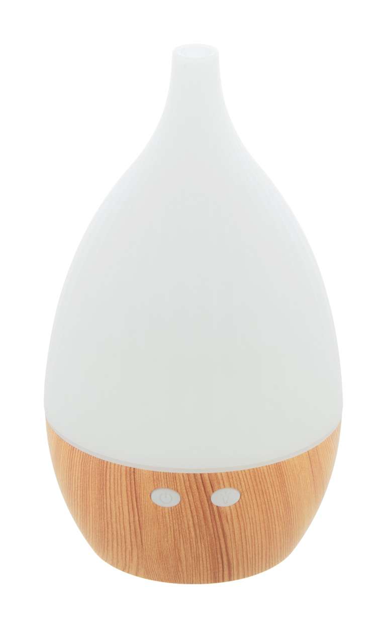 Umidificatore da tavolo in plastica PP riciclata con decorazione in legno e luce LED multicolore. Incluso cavo di ricarica USB. Capacità del serbatoio: 120 ml.