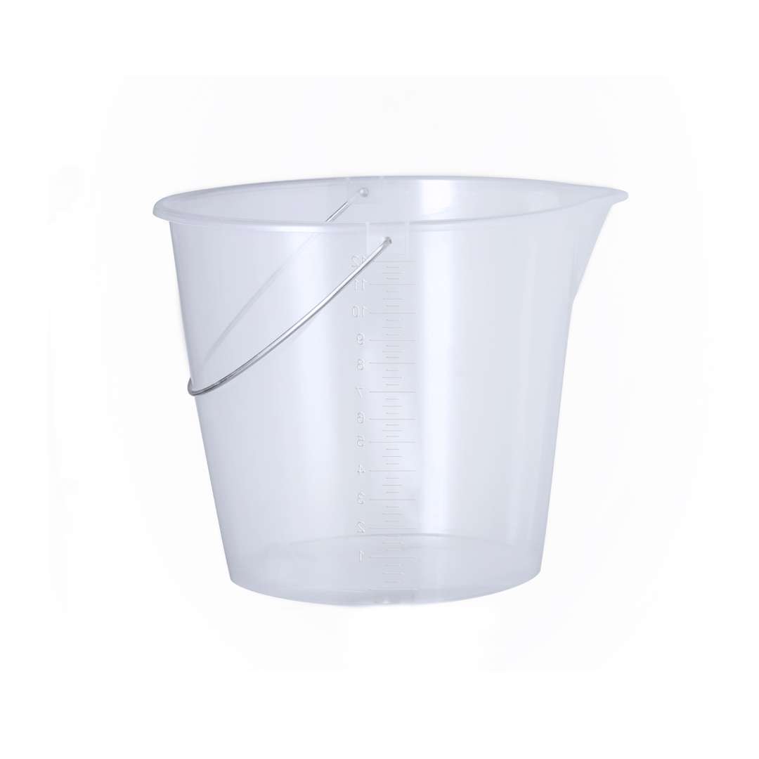 Secchio da 12 L realizzato in resistente PP trasparente. Con maniglia in metallo e misuratore laterale in ml per una visualizzazione facile e veloce. Con profilo arrotondato e beccuccio per evitare fuoriuscite, oltre ad un'ampia area di stampa.